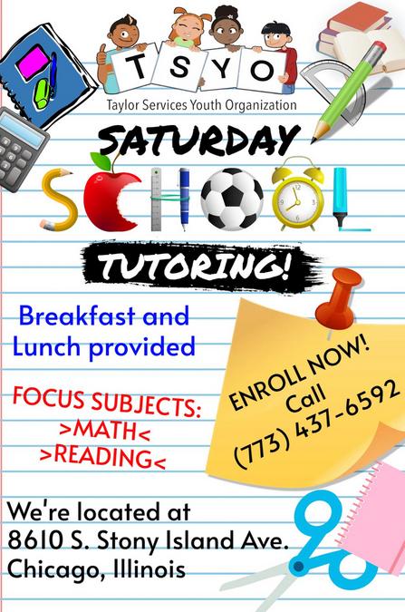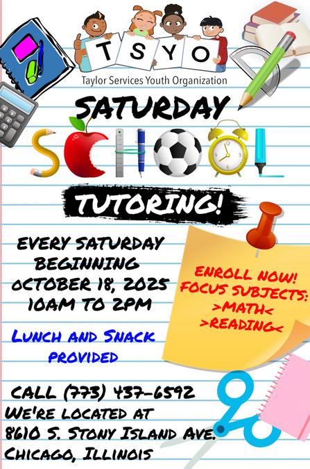 Join Taylor Services Youth Organization’s Saturday Tutoring Program, every Saturday (beginning October 18, 2025) from 10am to 2pm, located at 8610 South Stony Island Avenue, Chicago. Our Saturday sessions are designed to strengthen academic skills, build confidence, and encourage social and emotional growth—all within a safe and supportive environment. With caring and experienced tutors, each student receives individualized attention and guidance to help them reach their full potential.